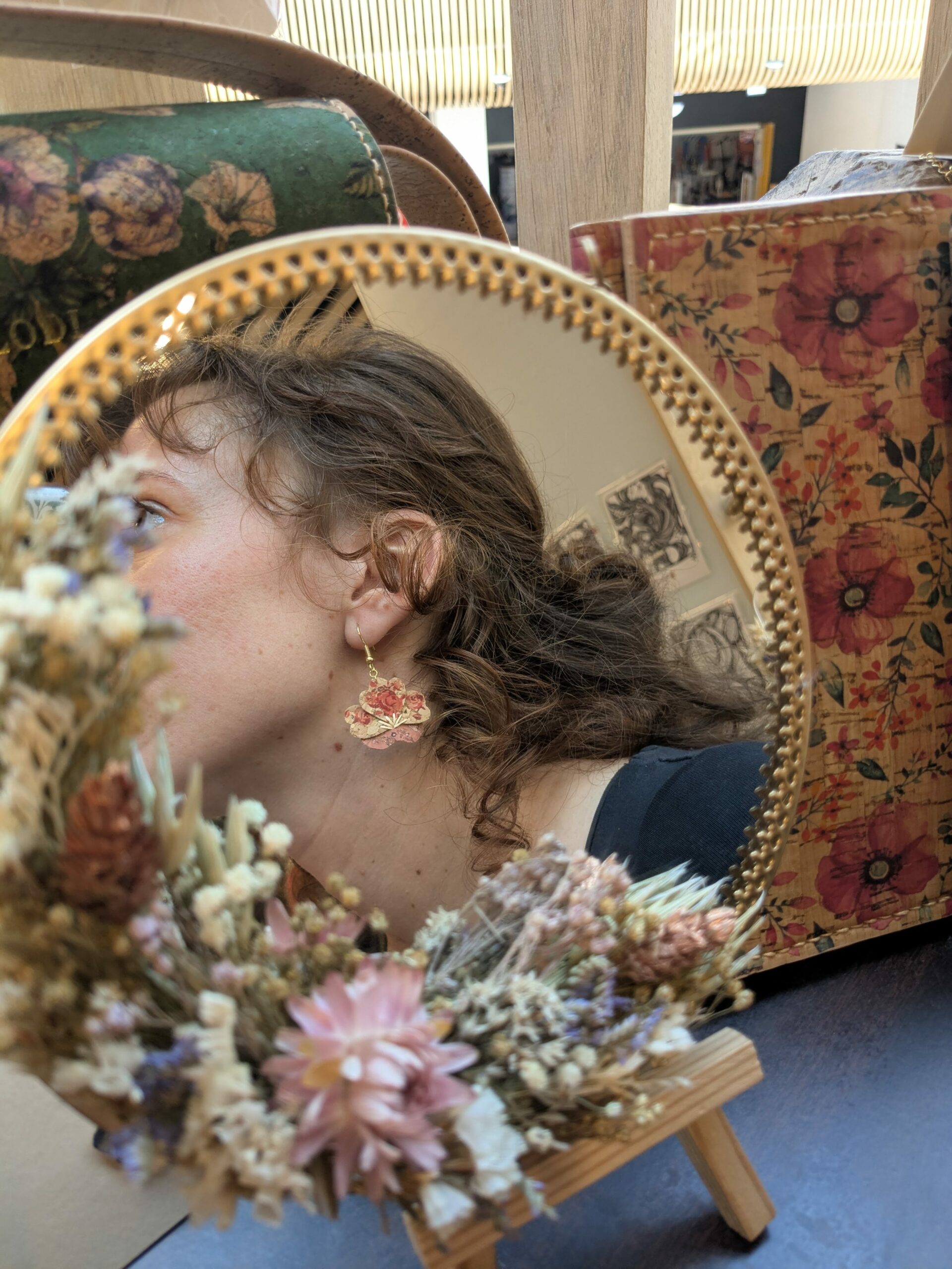 Légères et délicates, ces boucles d’oreilles en liège dans les tons beiges avec de légers motifs floraux apporte une touche de douceur à votre tenue.